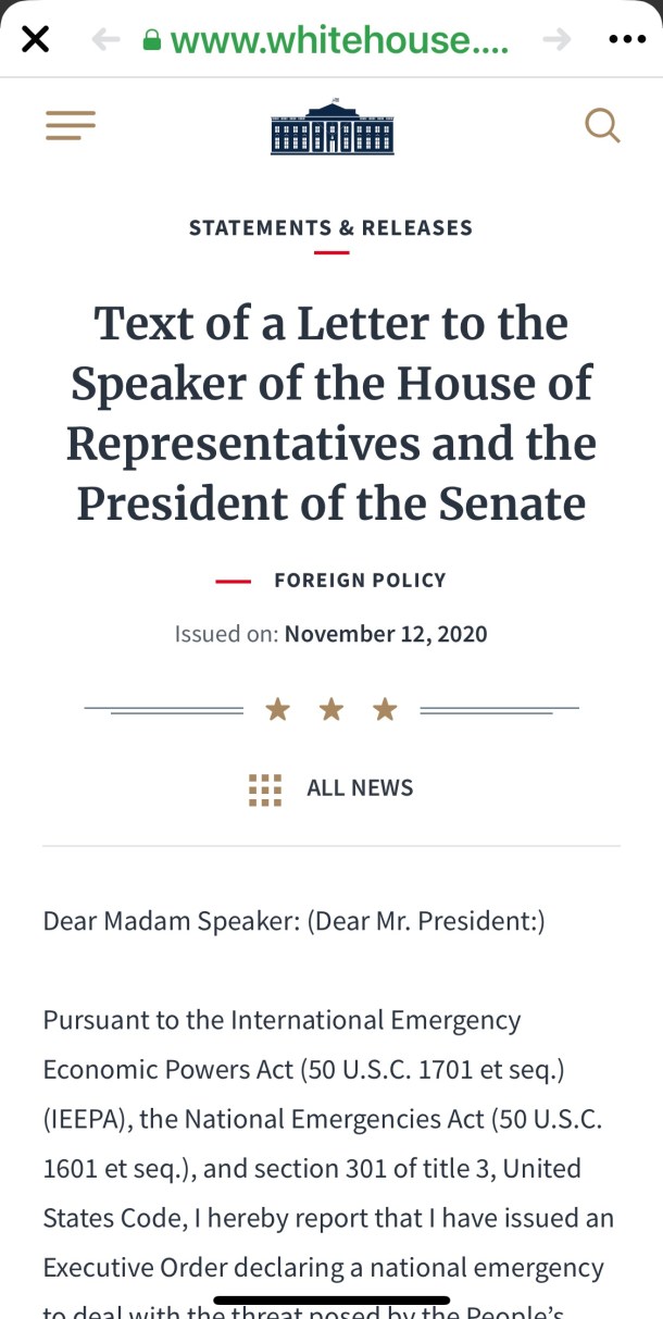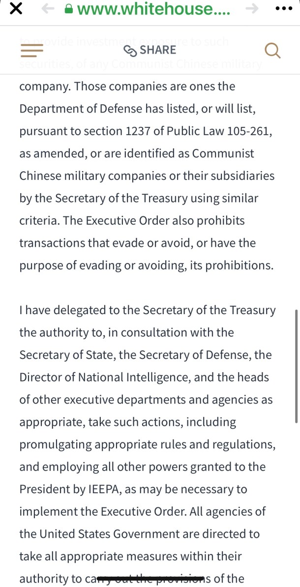 「我已授權財政部長與國務卿、國防部長、國家情報總監以及其它行政部門和機構的負責人協商,酌情採取行動,包括頒布適當的規則和條例,並在必要時動用《國際緊急狀態經濟權力法》授予總統的所有其它權力,以執行該行政命令。美國政府的所有機構都應在其職權範圍內採取一切適當措施,執行該行政命令的規定。」