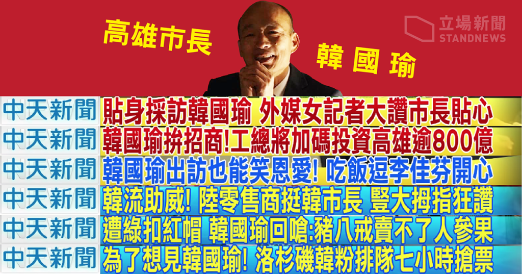 捍衛新聞自由? 中天「新聞」無恥挺韓全紀錄 Posted on 2020 年 11 月 18 日 by 李鴻彥 發表留言 我最記得是台灣選舉期間,將國民黨候選人韓國瑜神化,連飲水舉起尾指這些垃圾習慣亦說成聰明省力有智慧云云。 其他被罰款案例一籮籮,蔡老闆還好意思說什麼捍衛新聞自由? JL 分享此文: 分享到 WhatsApp(在新視窗中開啟) WhatsApp Tweet 按一下即可以電子郵件傳送連結給朋友(在新視窗中開啟) 電子郵件 點這裡列印(在新視窗中開啟) 列印 分享到 Reddit(在新視窗中開啟) Reddit 在 Tumblr 上分享Pocket 按一下以分享到 Telegram(在新視窗中開啟) Telegram 喜歡 正在載入... 相關