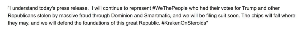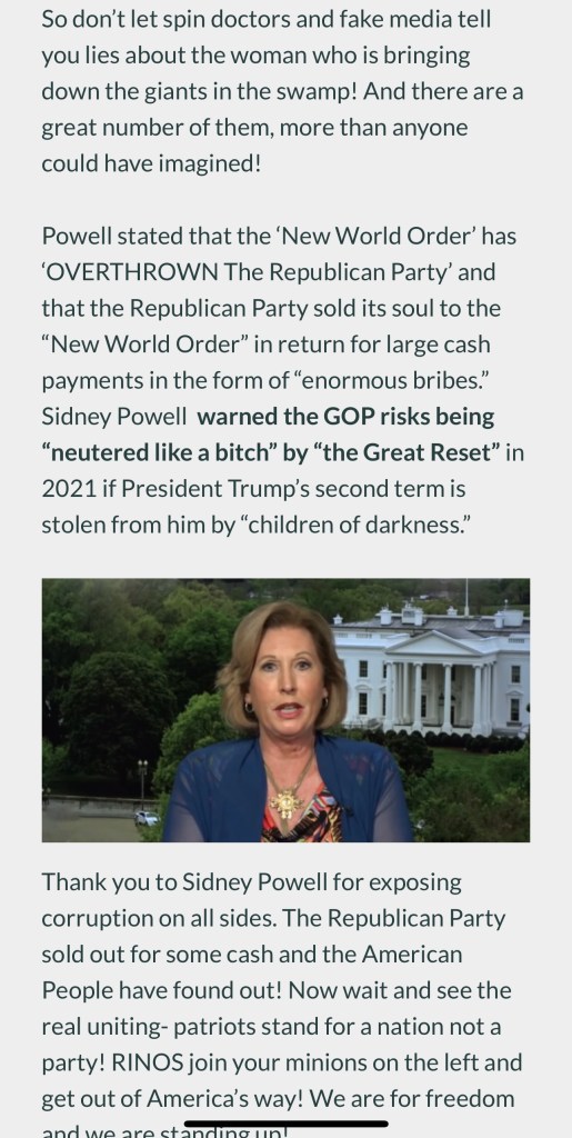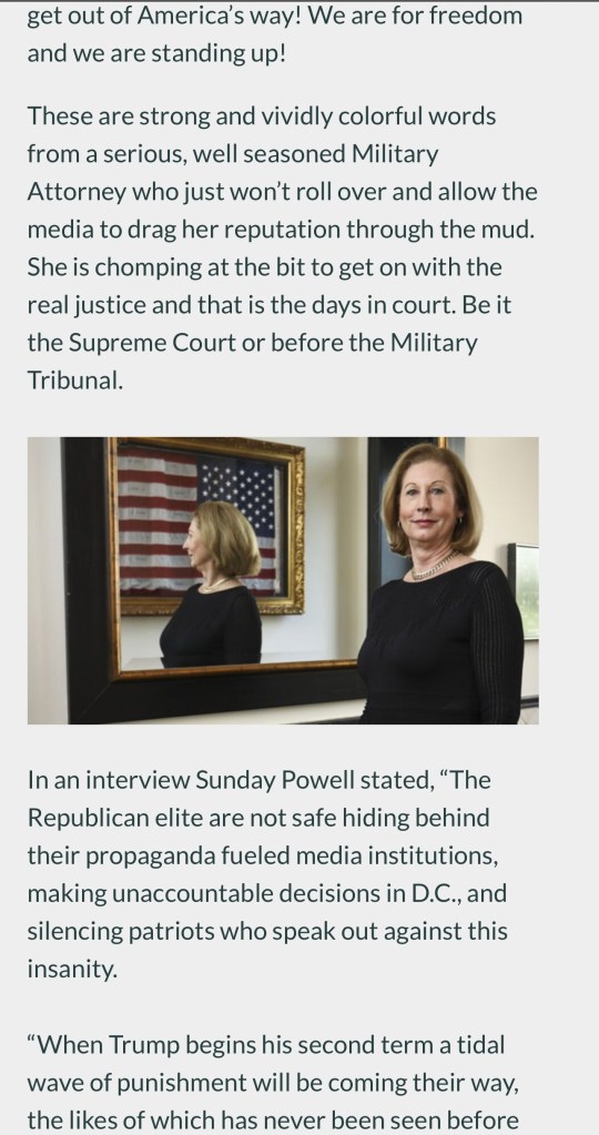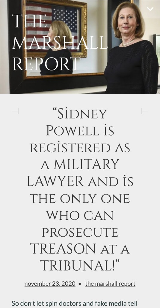 “Sidney Powell is registered as a MILITARY LAWYER and is the only one who can prosecute TREASON at a TRIBUNAL!"