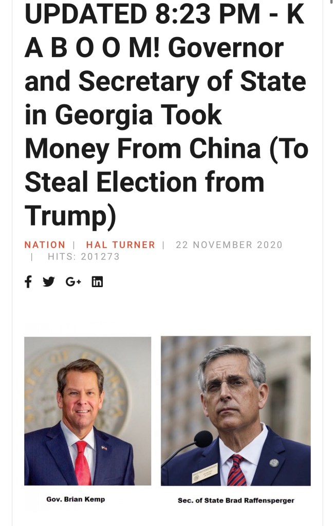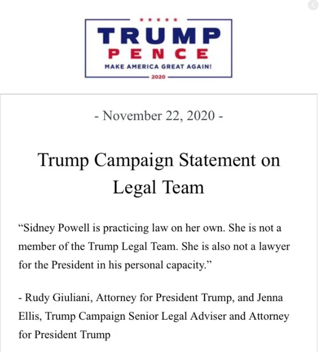 《The Marshall Report》報道指出,Sidney Powell周日(11月22日)接受訪問並指控,佐治亞州州長Brian Kemp及秘書Brad Raffensperger收取中國金錢,協助民主黨候選人拜登「竊取」這次選舉。報道指出,Sidney Powell已註冊成為軍事律師,可以在軍事法庭就叛國罪提出起訴叛國罪。