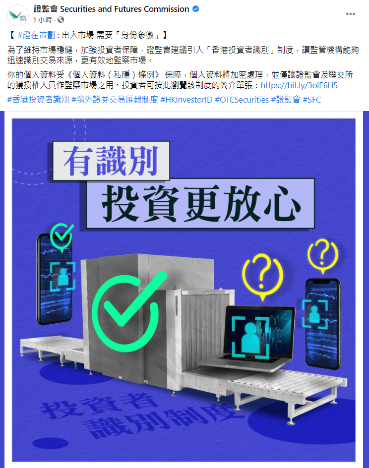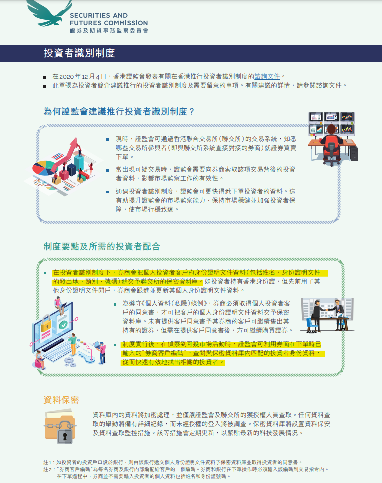 為了維持市場穩健,加強投資者保障,證監會建議引入「香港投資者識別」制度,讓監管機構能夠迅速識別交易來源,更有效地監察市場。你的個人資料受《個人資料(私隱)條例》 保障,個人資料將加密處理,並僅讓證監會及聯交所的獲授權人員作監察市場之用。