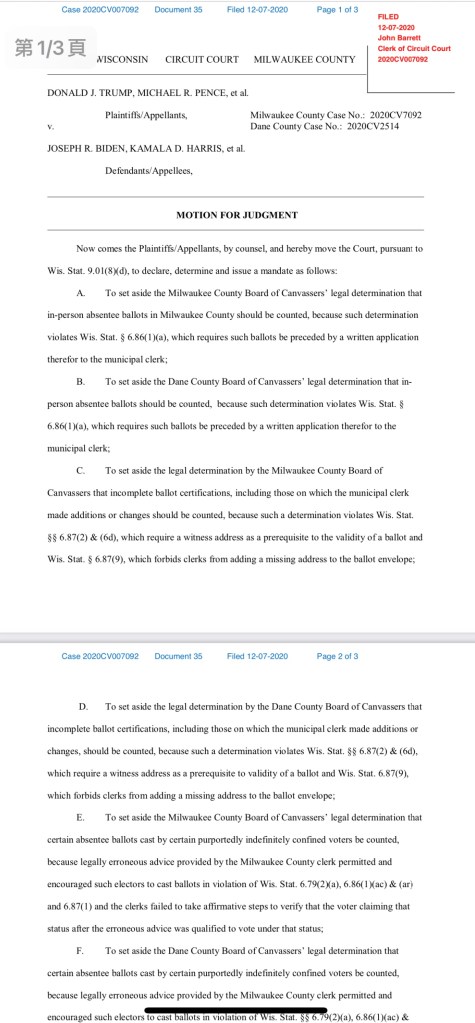綜合外媒報導,特朗普7日在威斯康辛州的民主黨大票倉密爾瓦基郡和戴恩縣,直接以私人名義提告民主黨候選人拜登,希望法院將這些地區的選票判定為無效選票。起訴狀可見,原告為「特朗普、彭斯等人」,而被告則是「拜登、賀錦麗等」。據悉,密爾瓦基郡和戴恩縣都是黑人選民居多的地區。
