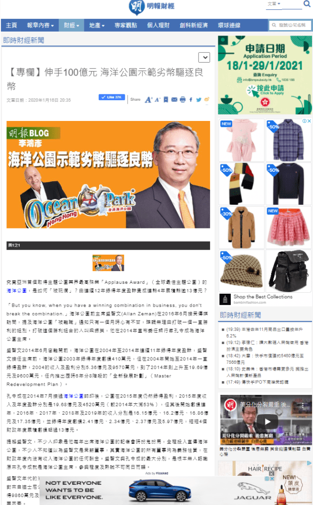 關於海洋公園的墮落、滅亡,我先後在2020年1月及2020年5月撰文及錄製短片詳細講解,前者在《明報》以〈伸手100億元 海洋公園示範劣幣驅逐良幣〉為題撰文;後者以〈海洋公園衰在一個人身上 輸血54億不如起公屋 盛智文激到跳舞〉(Link在下面)為題錄制短片,詳細講解海洋公園如何由盛智民於2004年接手至2014年被踢走期間,由一間年虧損410萬元的主題公園變成9600萬盈利,在此不贅。