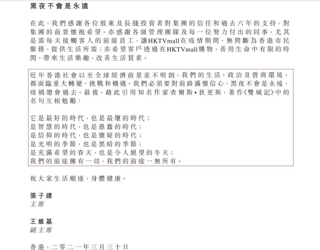 最後主席的話以〈黑夜不會是永遠〉為分題,引述《雙城記》作家狄更斯的最好的時代,祝生活順遂,身體健康。據了解,這番話不是主席張子建親撰,是否王維基語帶雙關,大家見到Ricky不妨自己問他。