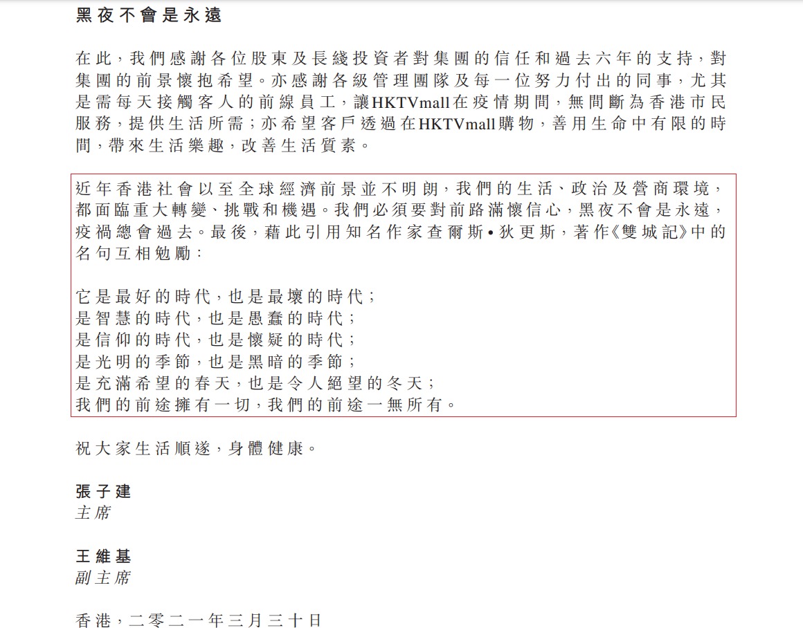 最後主席的話以〈黑夜不會是永遠〉為分題,引述《雙城記》作家狄更斯的最好的時代,祝生活順遂,身體健康。據了解,這番話不是主席張子建親撰,是否王維基語帶雙關,大家見到Ricky不妨自己問他。