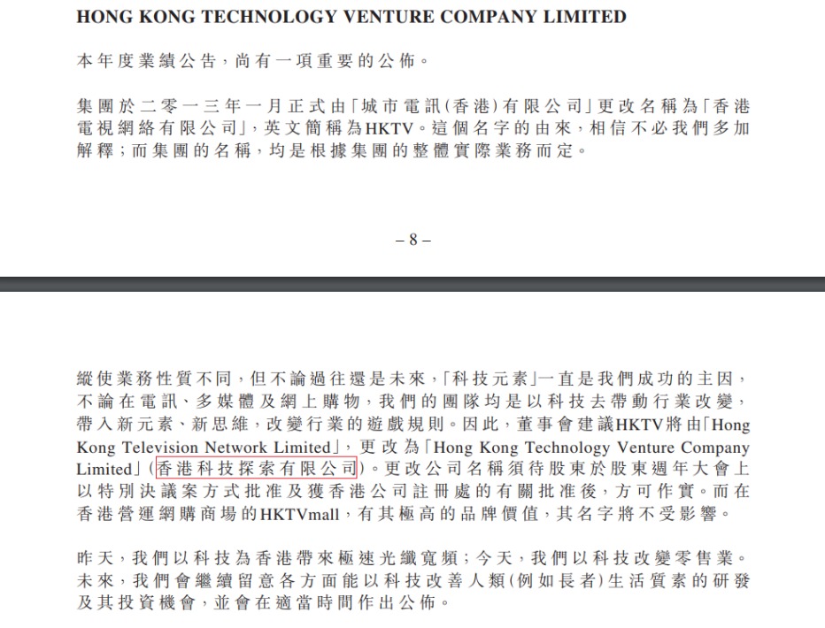 HKTV保留HKTV,只是變了Hong Kong Technology Venture Company Limited,中文名由香港電視網絡改為香港科技探索有限公司。坦白講,站在長線投資者角度中文名很特別,事關透過名稱你不會知道公司在做什麼,究竟探索什麼;不過站在短線投機者的話,名司名稱愈模糊愈好,事關有概念才可以短炒。