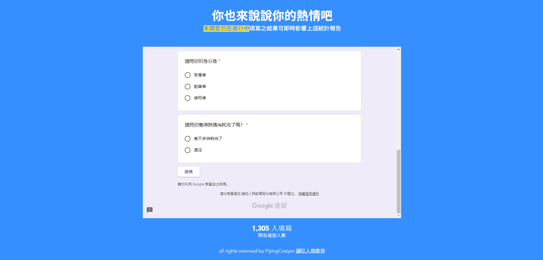 台灣企業「讓狂人飛教育」正進行一項名為〈你的熱情消耗完了嗎?〉(Over my dead Passion)的網上調查,列出15個不同範疇行業,讓網民自行填寫問卷,例如你的身份是受僱者、創業者還是接班者,又例請問你覺得熱情消耗完了嗎?等等簡單問題,再進行統計。雖然不夠科學但結果蠻有趣,分享供大家參考。