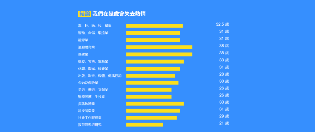 逾1,300人參與調查,結論是普遍25.4歲投身社會工作,但只須5.6年便可以耗盡對該行業範疇的熱情,有夠悲哀的。值得留意的是,撇除未投身社會便已沒有熱情的「教育與學術研究」,美術、藝術、文創業與醫療照護、生技業,失去熱情的年歲都是26歲,即是投身行業不久便已沒有熱情,「幻想」破滅;相反投身行業仍保持一定熱情的包括運動體育業(38歲)及營建業(38歲)。