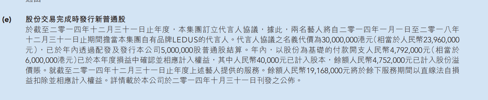 2) 德普支付代理人的費用是3000萬元,以每股6元發行500萬股支付,肥媽代言是否值3000萬元,與德普股票是否值6元一樣,反正大家都在「發水」,貴買貴賣兩不相欺,食得咸魚抵得渴。